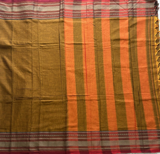 Narayanpet Cotton Saree Burnt Colored Complemented with a Thread Border.