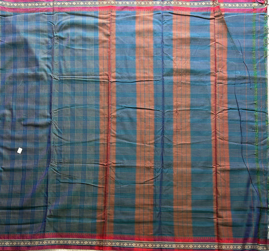 Narayanpet Cotton Checks Saree Dark Turquoise Blue Colored Complemented with a Thread Border.