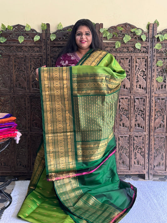 Gadwal Silk Saree Emerald Colored Complemented With Gold Zari Border