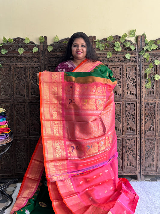 Gadwal Silk Saree Forest Colored Complemented With Gold Zari Border
