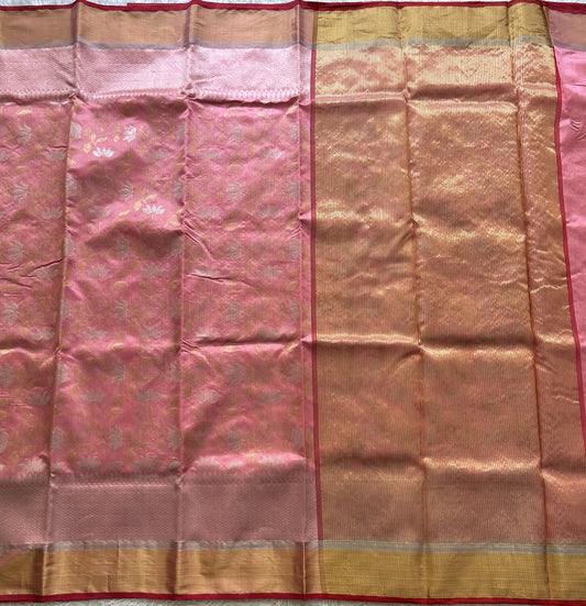Baby Pink Chanderi Silk Saree With Gold And Silver Zari Border — Pure Handloom | Silk Mark Certified