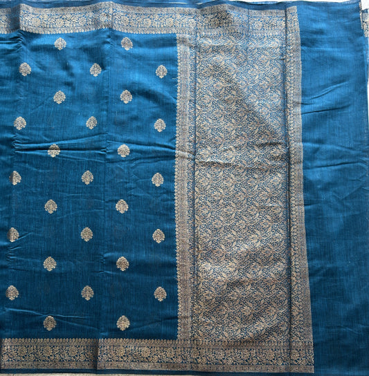 Peacock Blue Banarasi Raw Silk Saree with Gold Zari Border — Pure Handloom | Silk Mark Certified