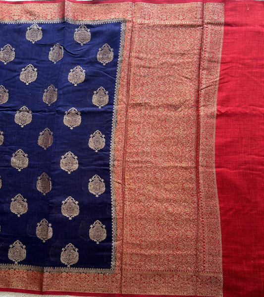 Carbon Blue Banarasi Raw Silk Saree with Gold Zari Border — Pure Handloom | Silk Mark Certified