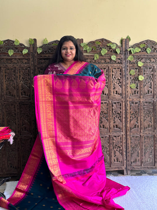 Gadwal Silk Saree Dark Teal Blue Colored Complemented With Gold And Silver Zari Border