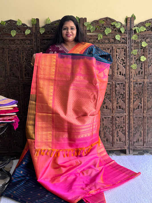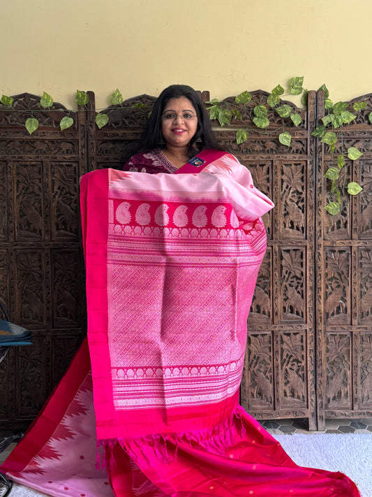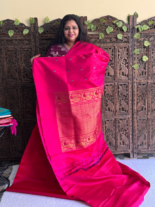Gadwal Silk Saree Hot Pink Colored Complemented With Gold Zari Border