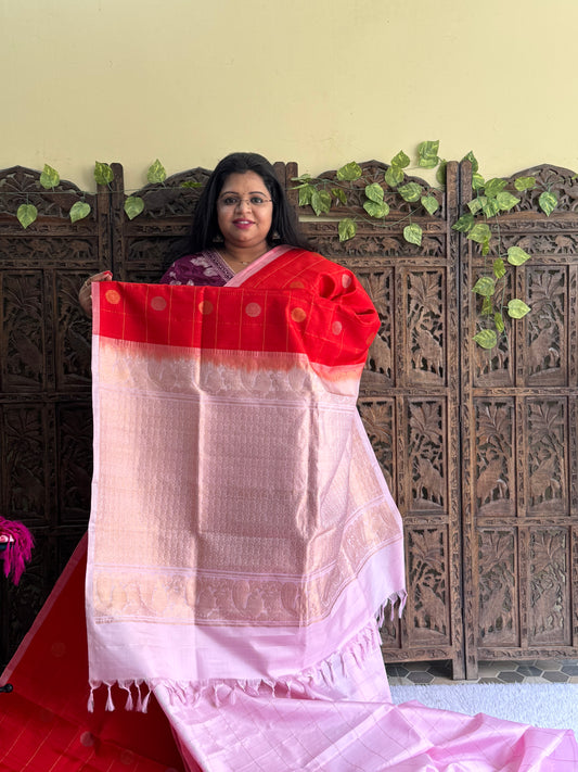 Narayanpet Cotton Checks Saree Imperial Red Colored Complemented with a Thread Border.