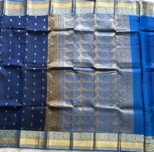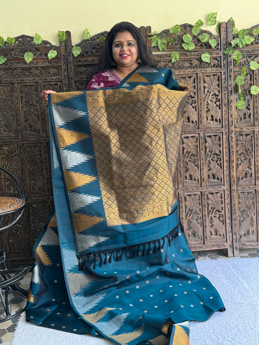 Gadwal Silk Saree Dark Teal Blue Colored Complemented With Gold Zari Border