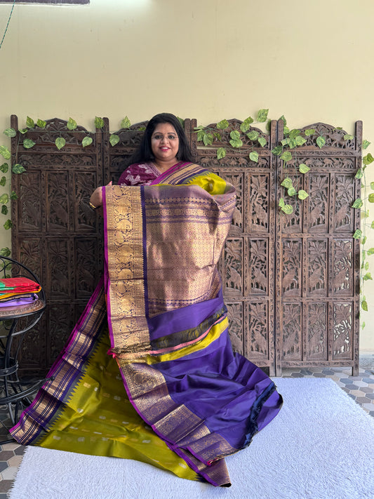 Gadwal Silk Saree Lime Colored Complemented With Gold Zari Border