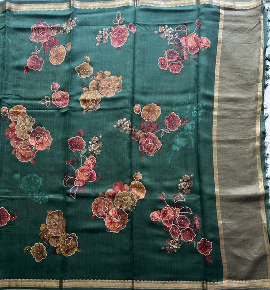 Green Chiniya Silk Saree with Gold Zari Border - Pure Handloom | Silk Mark Certified