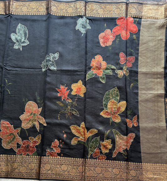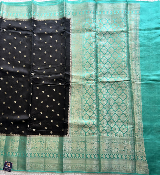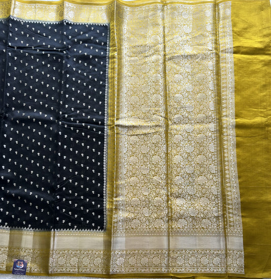 Black Chiniya Silk Saree with Gold Zari Border - Pure Handloom | Silk Mark Certified