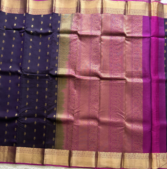 I chose this eggplant-colored Gadwal saree because I’ve always liked deeper shades for evening functions. I was a bit hesitant about how the color would look in person, but when I opened the package, it was even more beautiful than I expected. The tone is rich and has a nice depth to it.