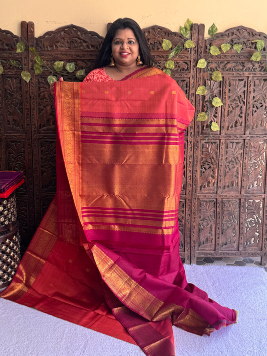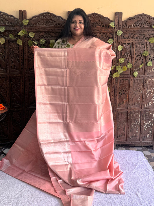 Pure Kanjivaram Silk Saree | Peach Pink With Gold Zari Border | Handloom | Silk Mark Certified