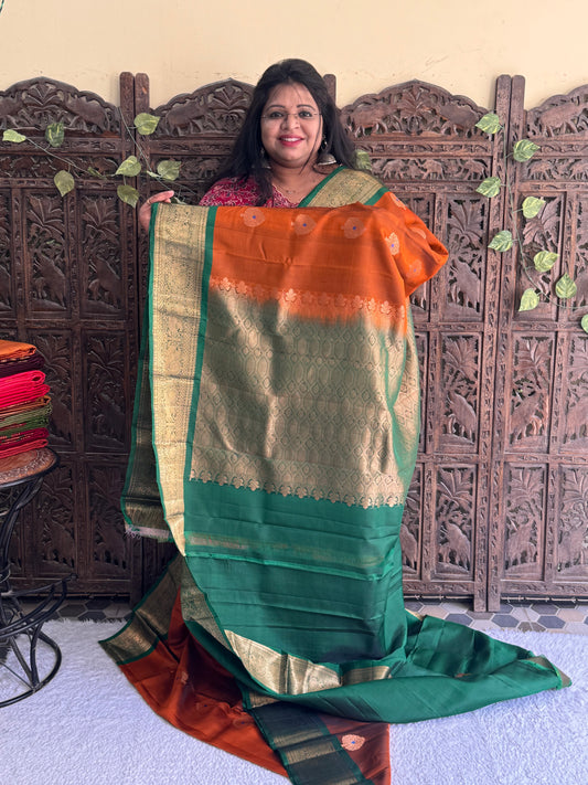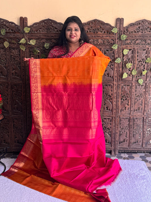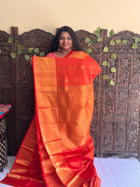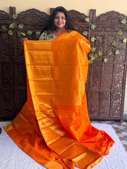 Pure Kanjivaram Silk Saree | Orange With Gold Zari Border | Handloom | Silk Mark Certified