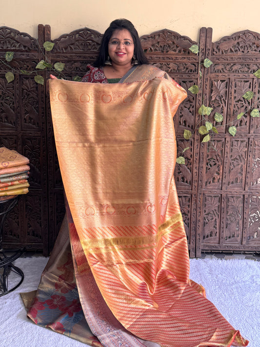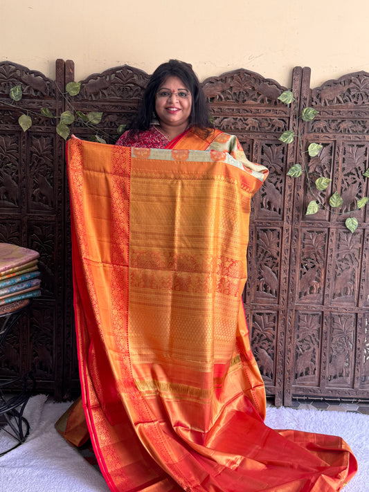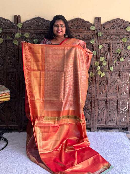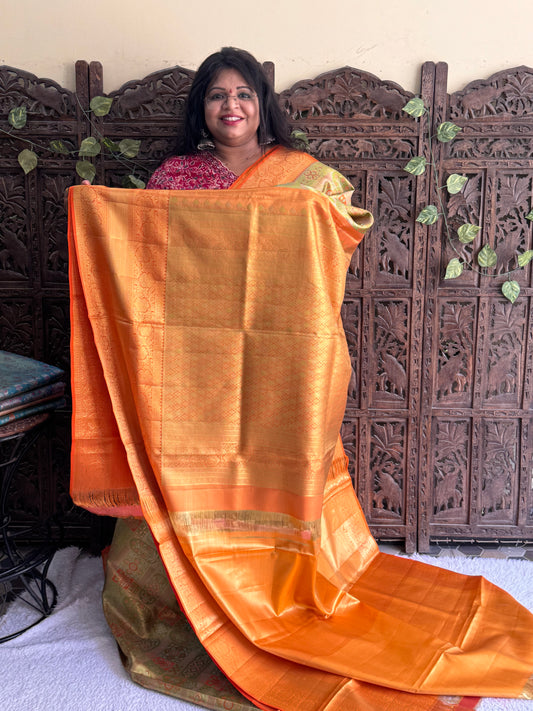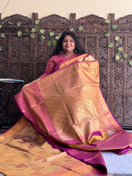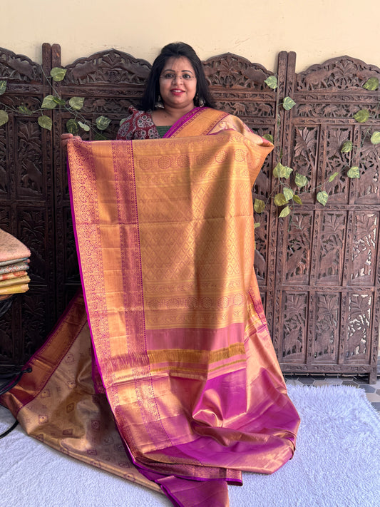 Peach Kanjivaram Bridal Silk Saree With Gold Zari Border | Handloom | Silk Mark Certified.
