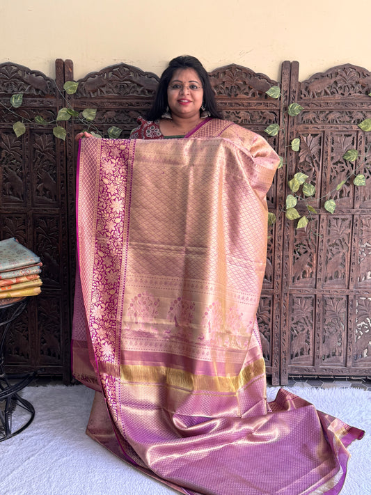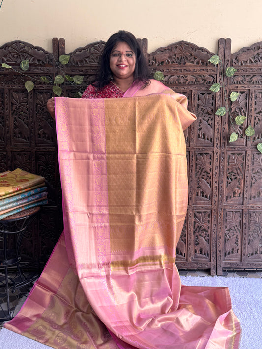 Baby Pink Kanjivaram Bridal Silk Saree With Gold Zari Border | Handloom | Silk Mark Certified.