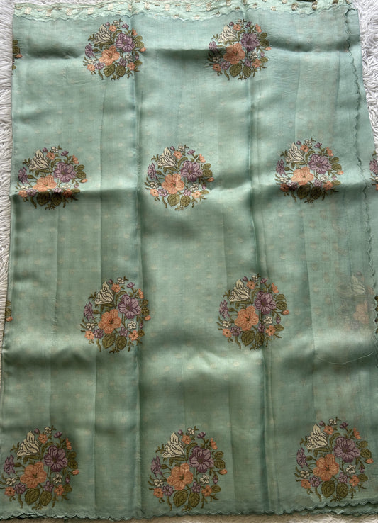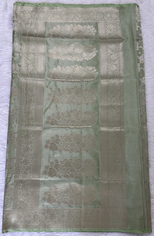 Banarasi Kora Saree Light Pista Green Colored Complemented with a Machine Embroidery And Scallop Border.