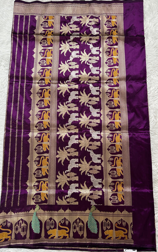 Banarasi Katan Silk Saree Violet Colored Complemented with a Gold Zari border.