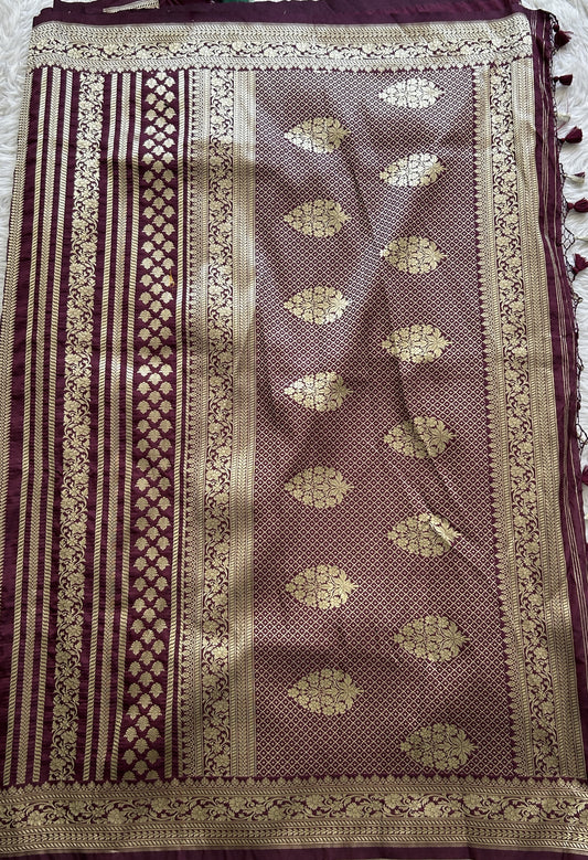 Banarasi Soft Silk Saree Dark Mauve Colored Complemented with a Zari Border.