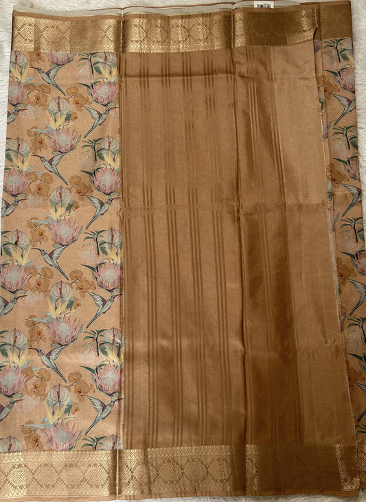 Dola Crepe Saree Brown Colored Complemented with a Zari Border.