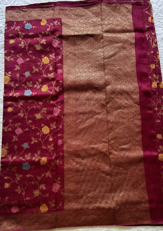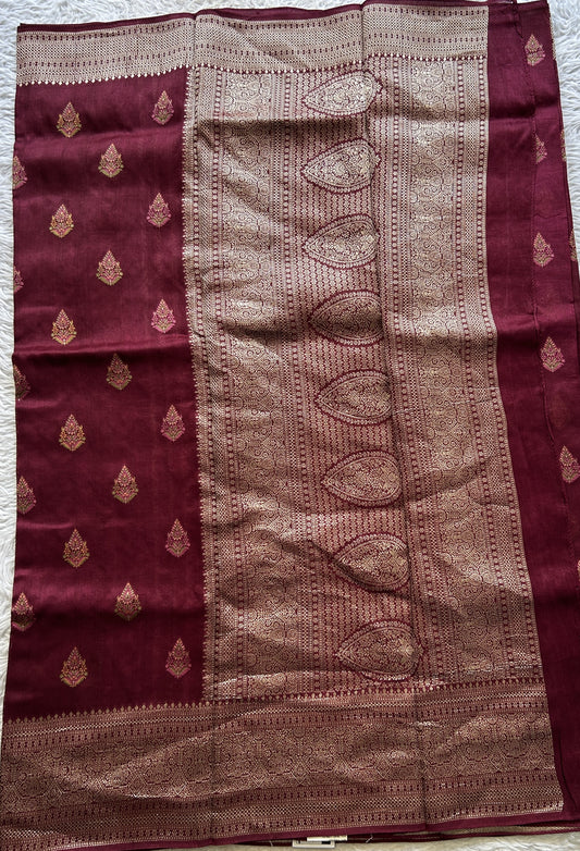Banarasi Tussar Georgette Allover Saree Burgundy Colored Exquisite Zari Border.