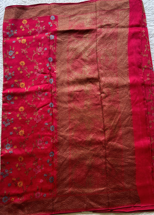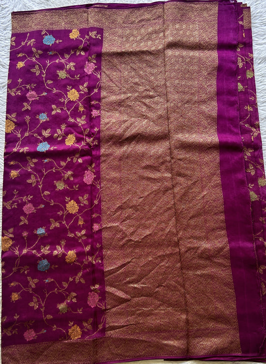Banarasi Tussar Georgette Allover Saree Magenta Colored Exquisite Zari Border.