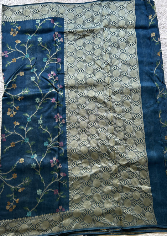 Banarasi Tussar Georgette Allover Saree Peacock Blue Colored Paired with a Zari Border.