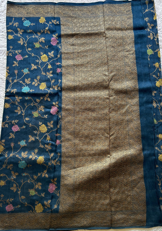 Banarasi Tissue Kora Saree Sea Blue Colored Complemented with a Zari Border.