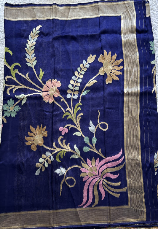 Banarasi Tussar Georgette Plain Saree Navy Blue Colored Exquisite Zari Border.