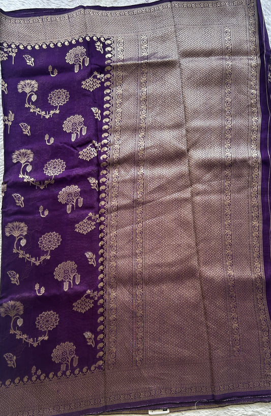 Banarasi Tussar Georgette Saree Deep Violet Colored Paired With a Zari Border.