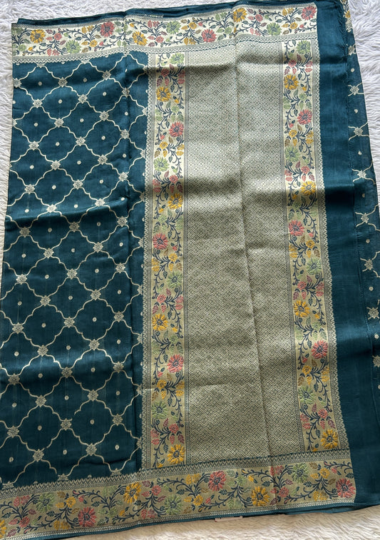 Banarasi Tussar Georgette Saree Peacock Blue Colored Paired with a Zari Border.