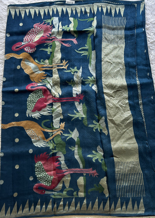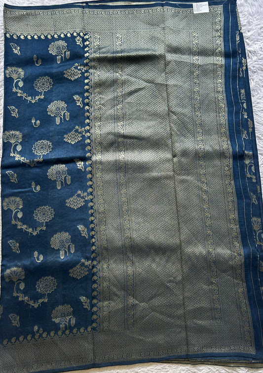 Banarasi Tussar Georgette Saree German Blue Colored Exquisite Zari Border.