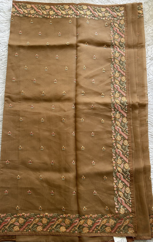 Dola Crepe Saree Brown Colored Complemented with a Zari Border.