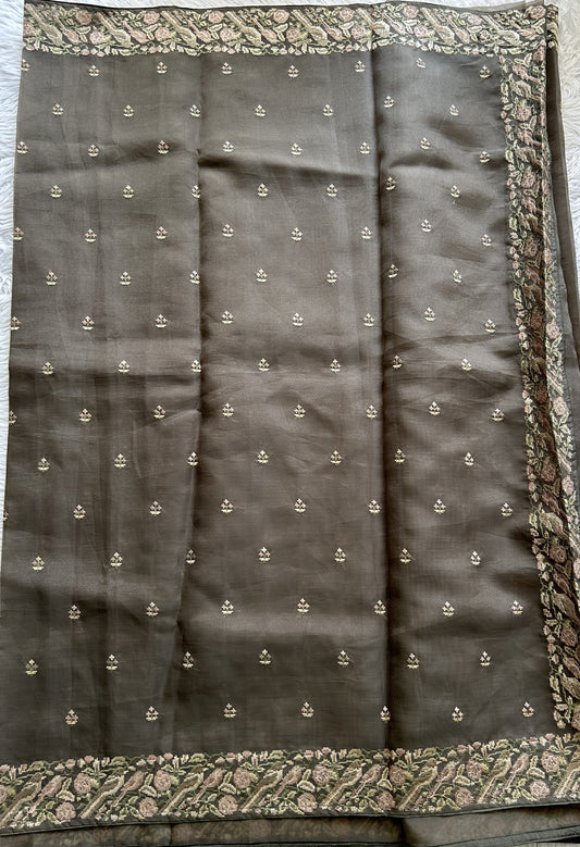 Banarasi Fancy Saree Gray Colored Complemented with a Zari Border.