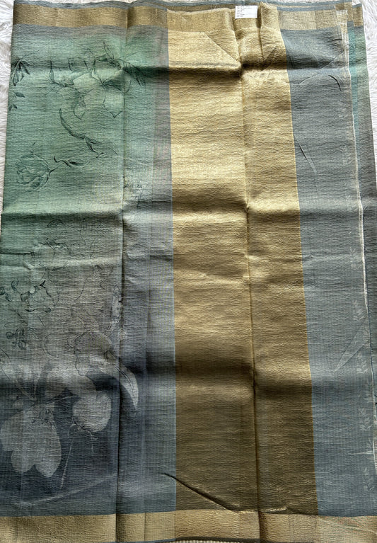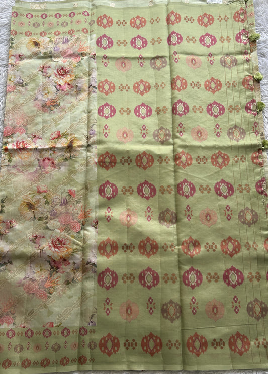 Banarasi Fancy Saree Light Green Colored Complemented with a Floral Printed Border.
