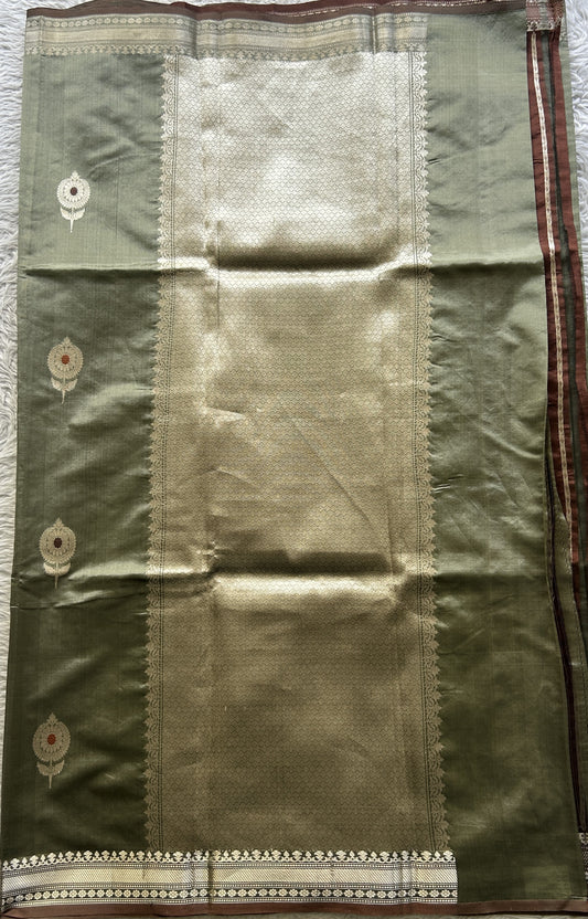 Banarasi Katan Silk Saree Olive Green Colored Complemented with a Zari border.