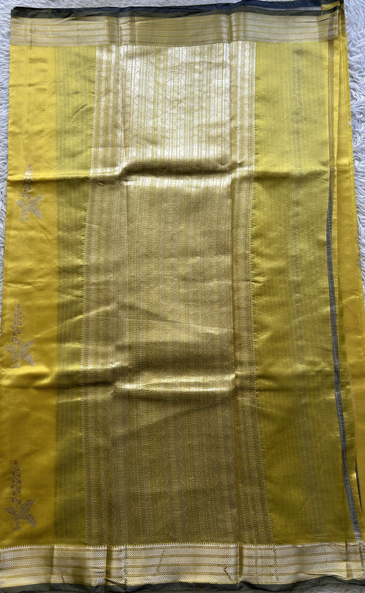 Banarasi Katan Silk Saree Canary Colored Elegantly Paired with a Zari border.