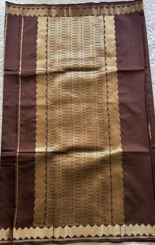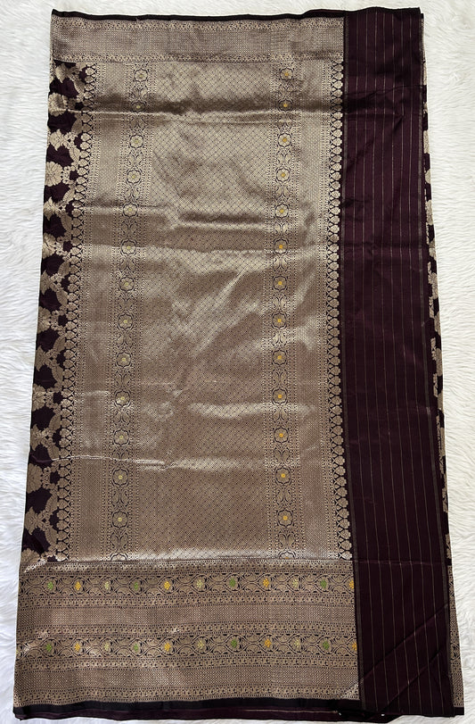 Banarasi Katan Silk Saree Dark Brown Colored Complemented with a Gold Zari border.