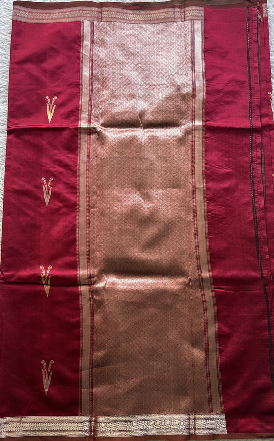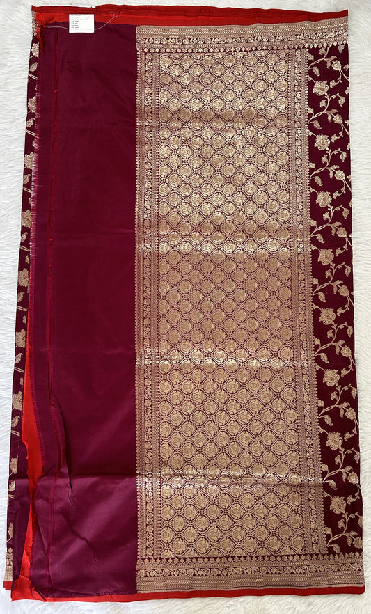 Banarasi Katan Silk Saree Maroon Colored Complemented with a Gold Zari border.