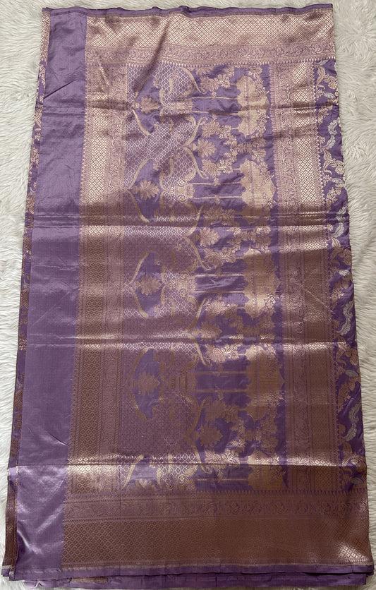 Banarasi Katan Silk Saree Lavender Colored Complemented with a Gold Zari border.