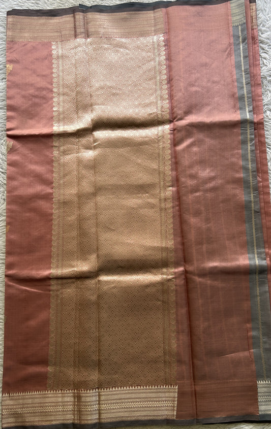 Banarasi Katan Silk Saree Dark Peach Colored Complemented with a Gold Zari border.