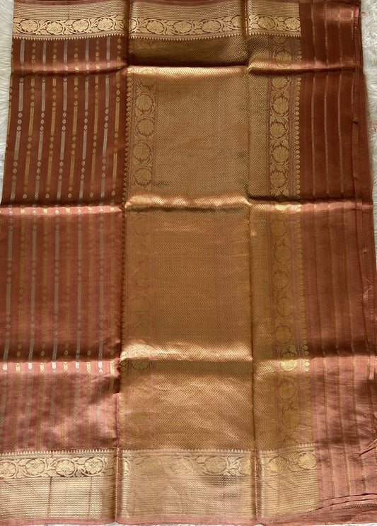 Banarasi Katan Silk Saree Dark Peach Colored Complemented with a Gold Zari border.