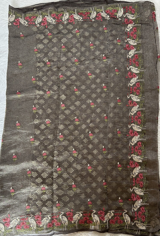 Banarasi Crushed Silk Saree Gray Colored Complemented with a Thread Embroidery border.