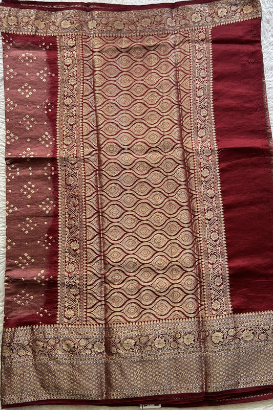 A Bandhini saree is created using traditional tie-dye techniques, also known as Bandhani or Bandhej, producing distinctive dotted patterns.