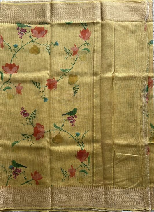 Maheshwari Chanderi Cotton Checks Saree Light Yellow Colored Complemented with a Digital Print And Gold Zari Border.