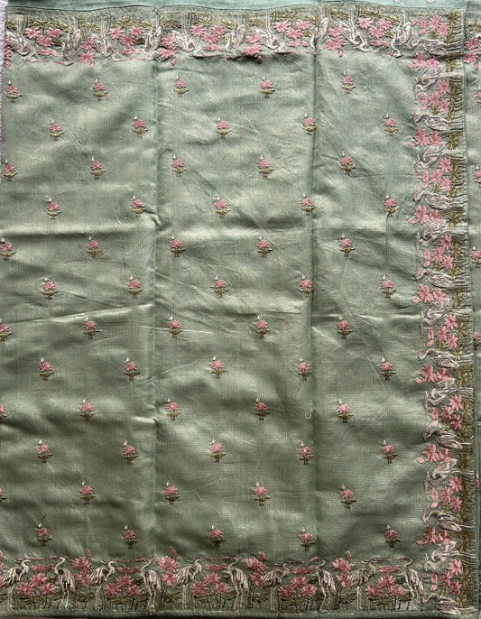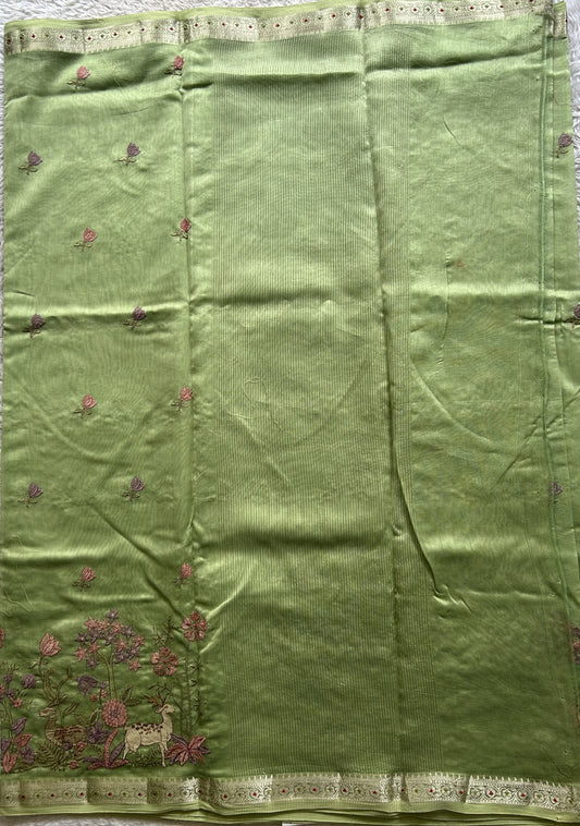 Maheshwari Chanderi Cotton Saree Porret Green Colored Complemented with a Machine Embroidered And Silver Zari Border.