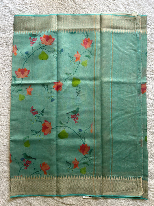 Maheshwari Chanderi Cotton Saree Aqua Green Colored Elegantly Paired with a Zari Border.