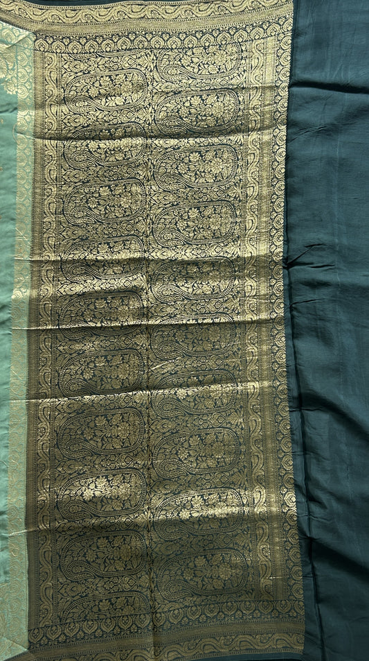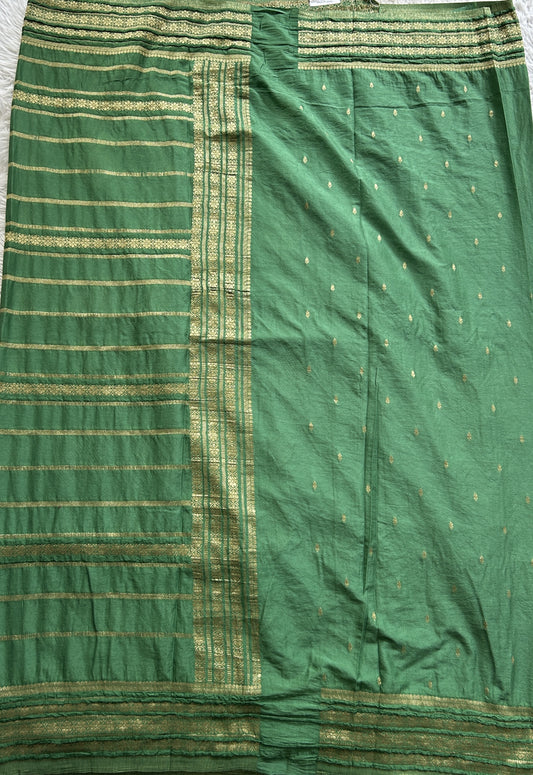 Banarasi Soft Silk Saree Bottle Green Colored Complemented with a Zari Border.