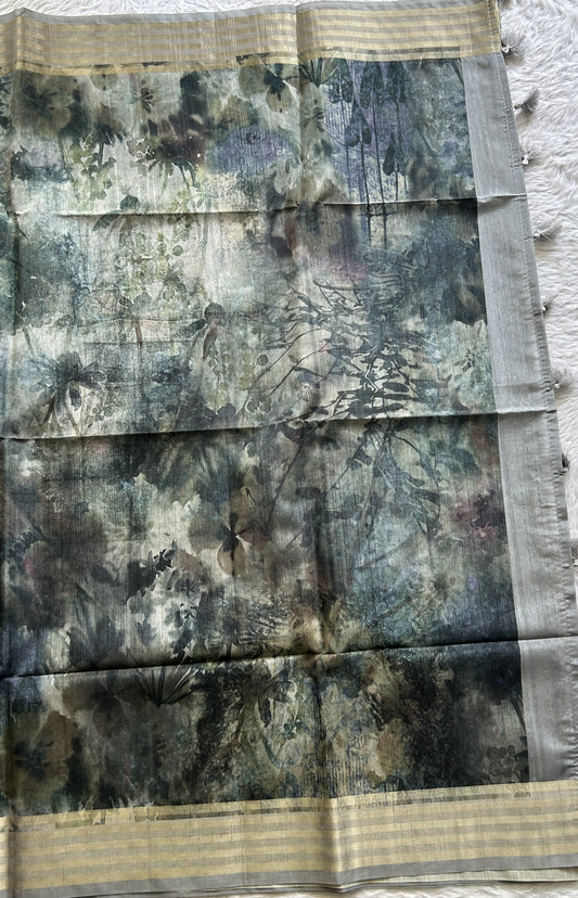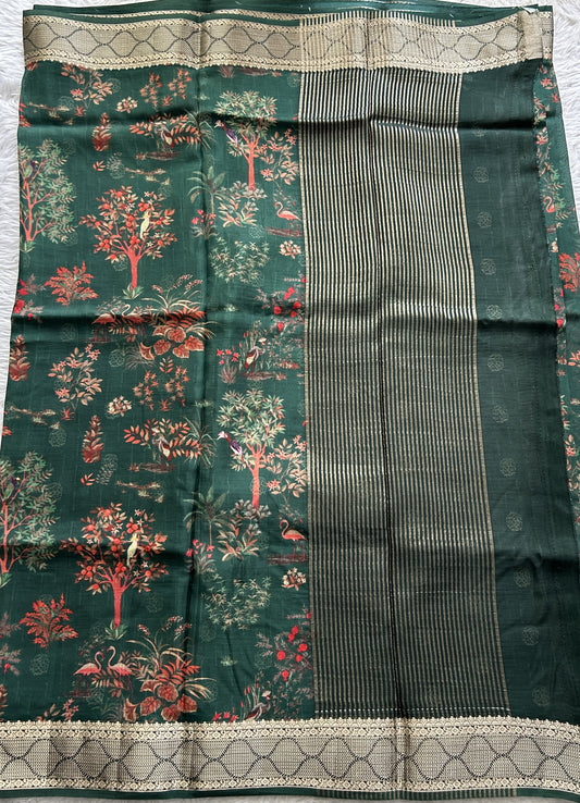 Semi Tussar Saree Bottle Green Colored complemented with a Gray Color Zari Border.