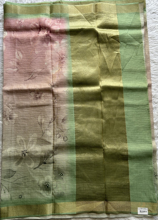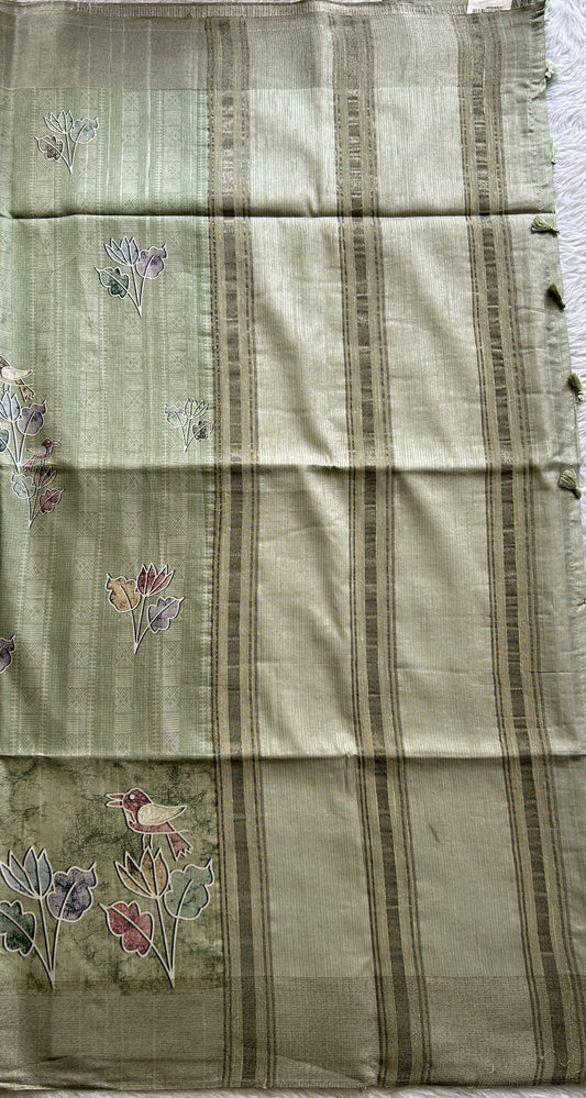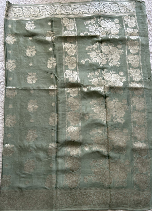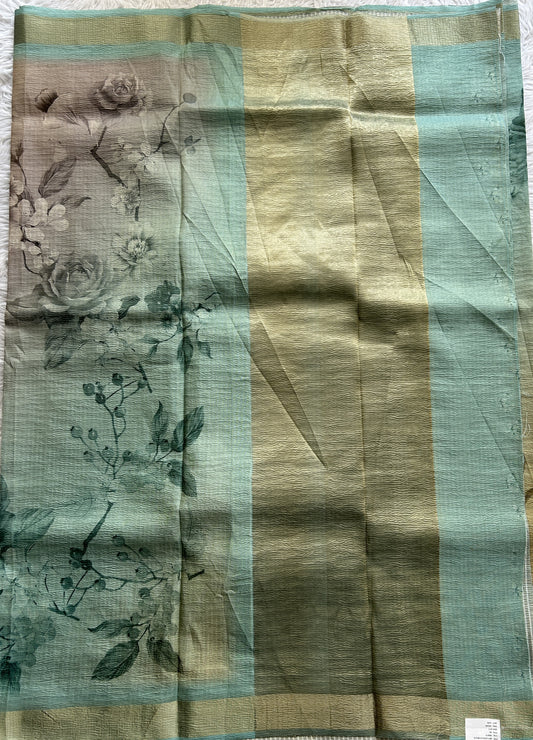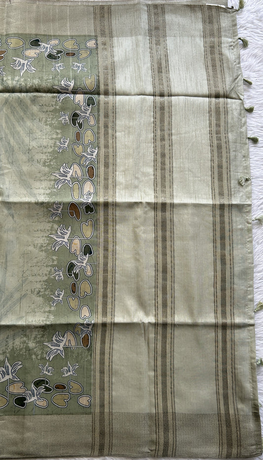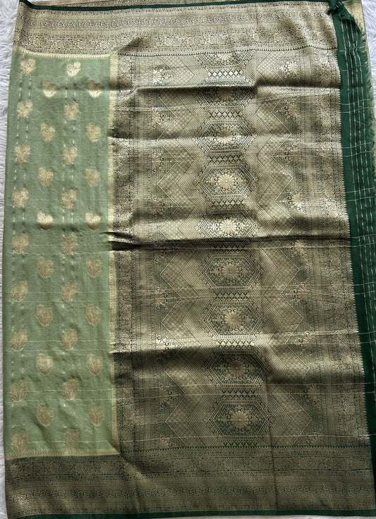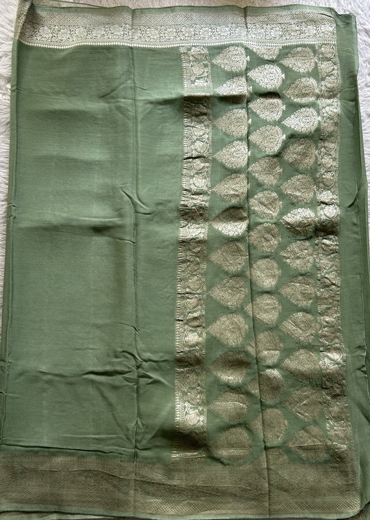 Chiffon Fancy Saree Sage Green Colored Complemented with a Zari Border.