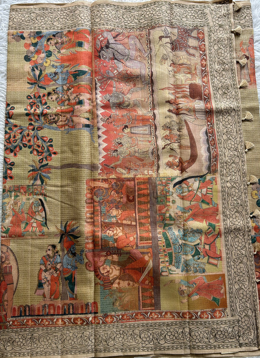 Semi Tussar Saree Mustard Yellow Colored complemented with a Beige Color Thread Embroidery Border.